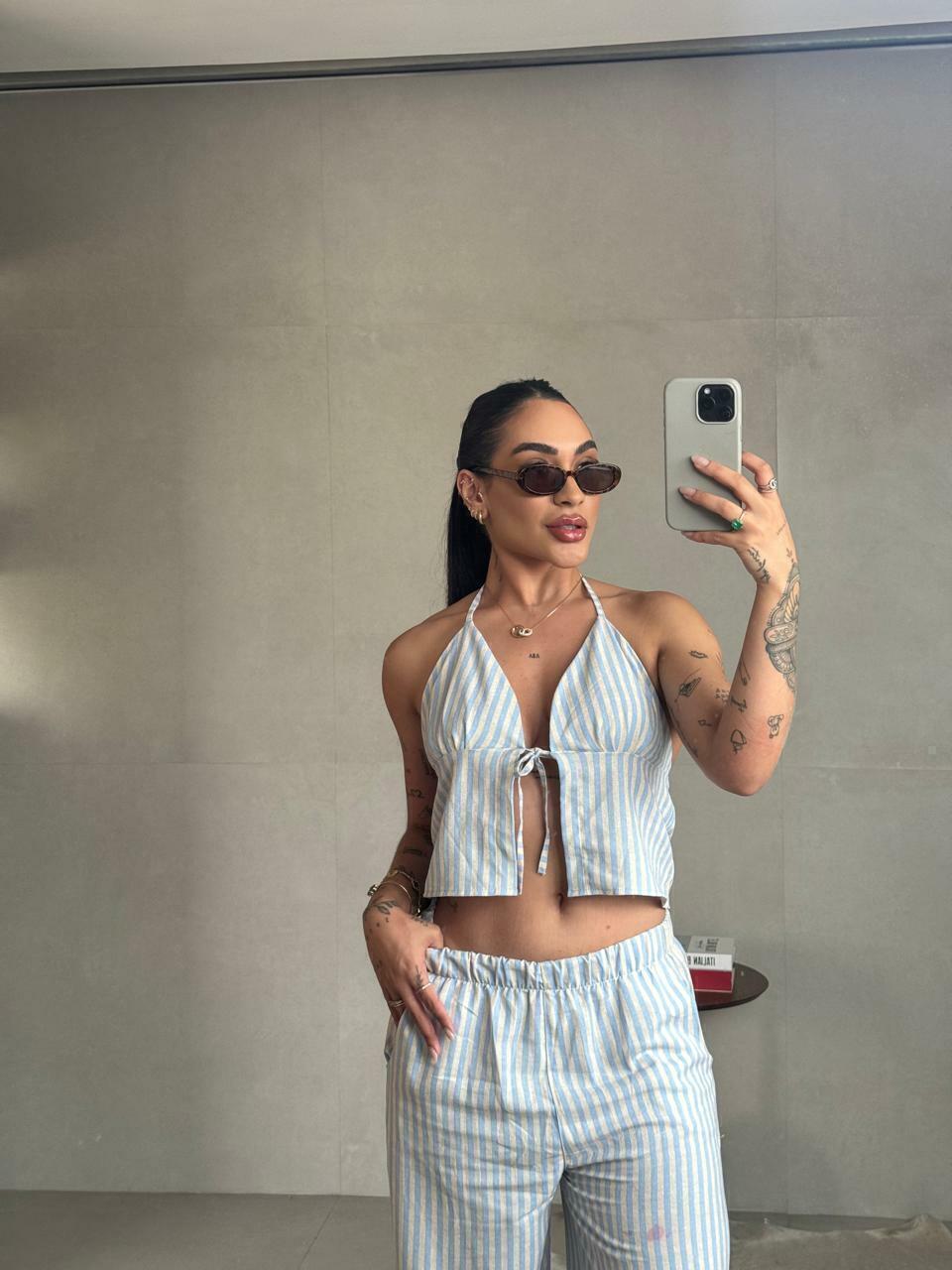A calça conta com elástico duplo na cintura, garantindo um ajuste perfeito e conforto ao longo do dia. Já o croped possui amarração para ajuste na parte do pescoço e no decote, permitindo que você personalize seu look de acordo com seu estilo.